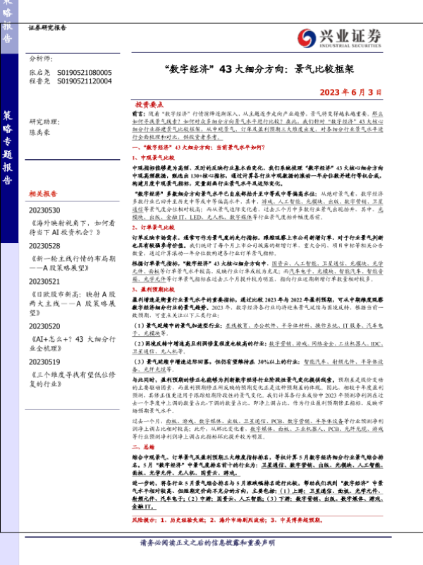 投资分析 数字经济 景气比较 细分行业 证券研究