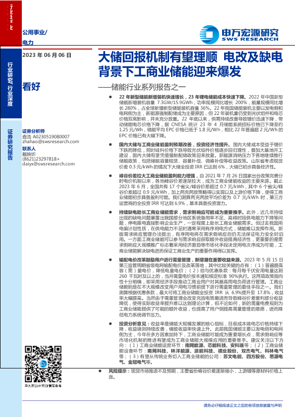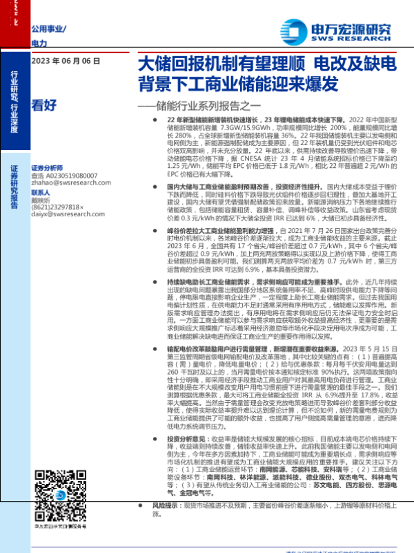 【申万宏源】【20230606】储能行业系列报告之一:大储回报机制有望理顺,电改及缺电背景下工商业储能迎来爆发-30页