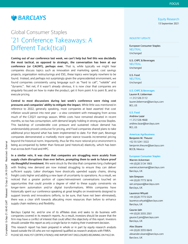 【巴克莱资本(Barclays Capital Inc.)】【20210913】巴克莱-全球投资策略-全球消费必需品之21年会议概要:不同的策略-92页