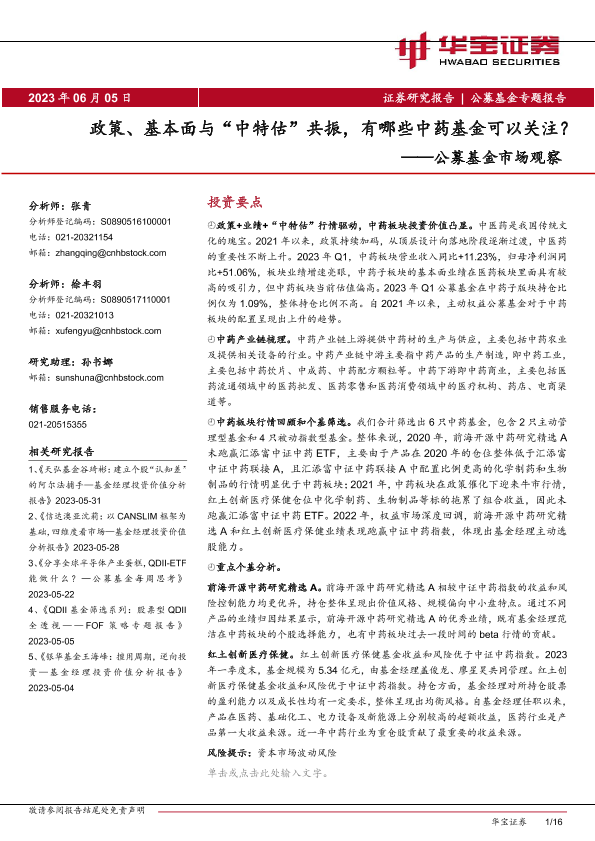 【华宝证券】【20230605】公募基金市场观察:政策、基本面与“中特估”共振,有哪些中药基金可以关注?-16页