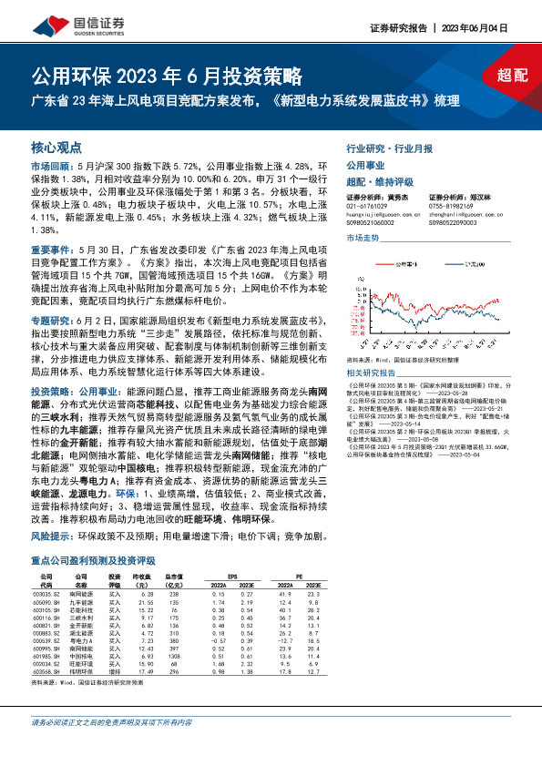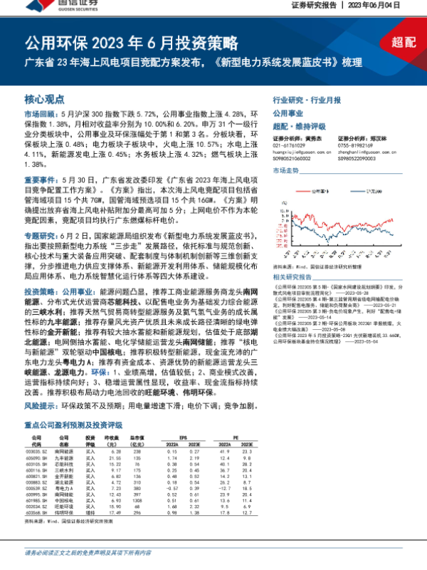 【国信证券】【20230604】公用环保行业2023年6月投资策略:广东省23年海上风电项目竞配方案发布,《新型电力系统发展蓝皮书》梳理-30页