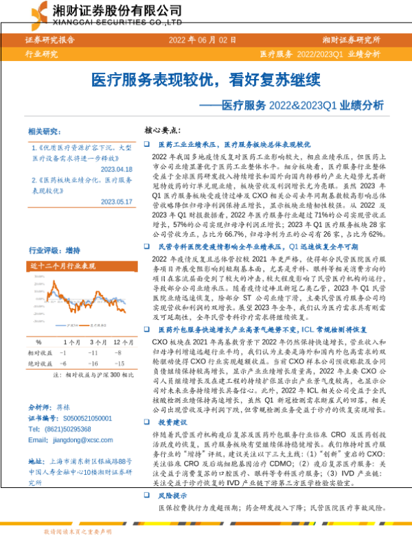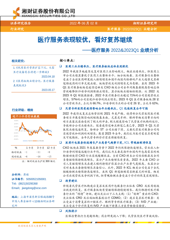 【湘财证券】【20230602】医疗服务行业2022&2023Q1业绩分析:医疗服务表现较优,看好复苏继续-15页