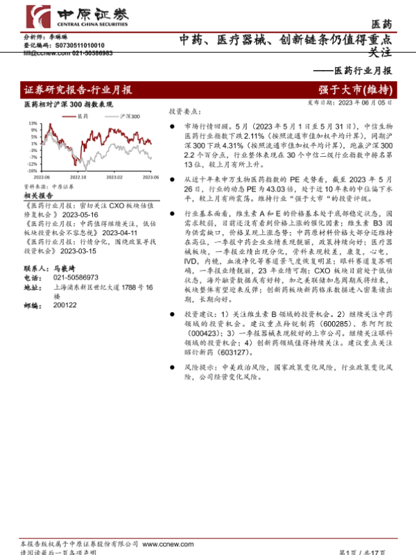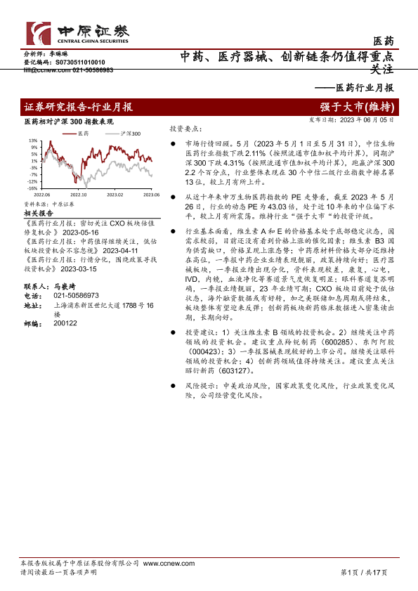 【中原证券】【20230605】医药行业月报:中药、医疗器械、创新链条仍值得重点关注-17页