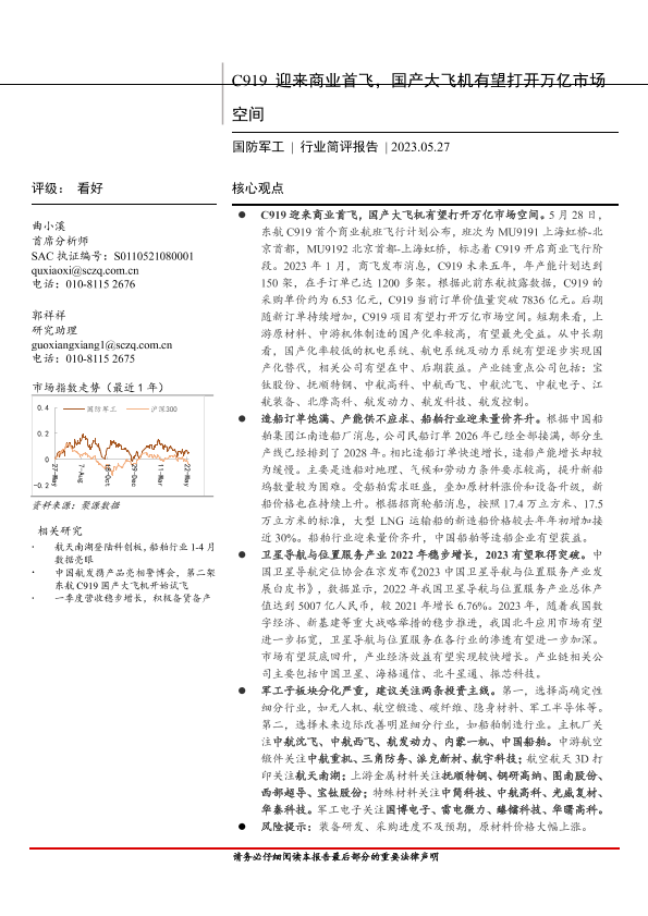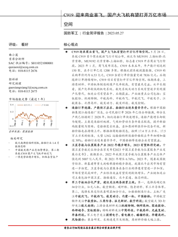 【首创证券】【20230527】国防军工行业简评报告:C919迎来商业首飞,国产大飞机有望打开万亿市场空间-19页