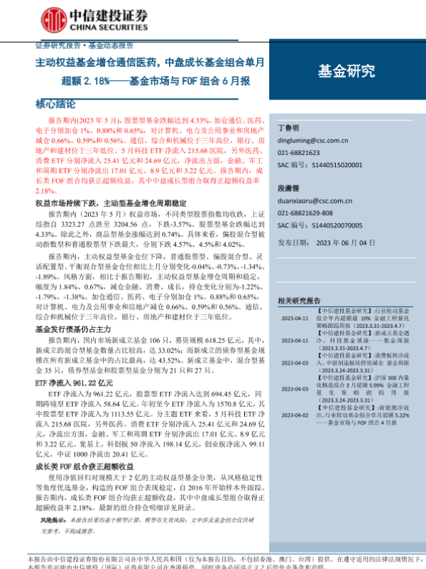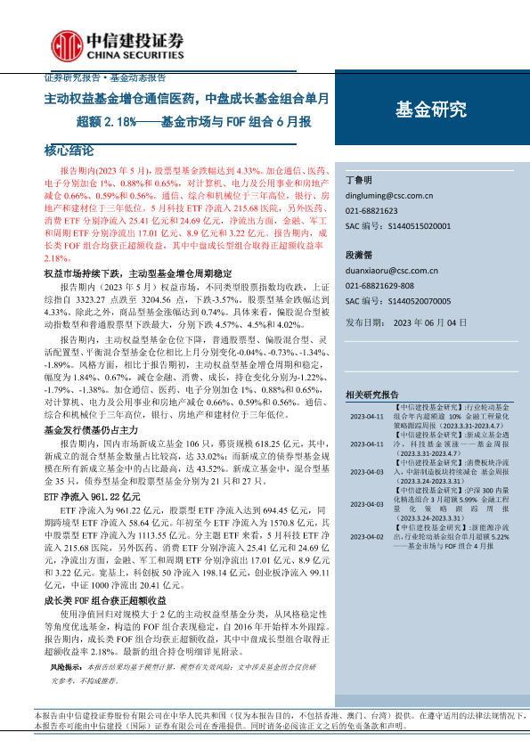 【中信建投证券】【20230604】基金市场与FOF组合6月报:主动权益基金增仓通信医药,中盘成长基金组合单月超额2.18%-24页