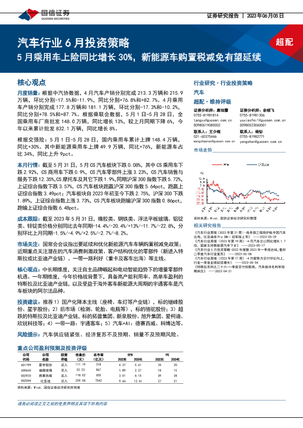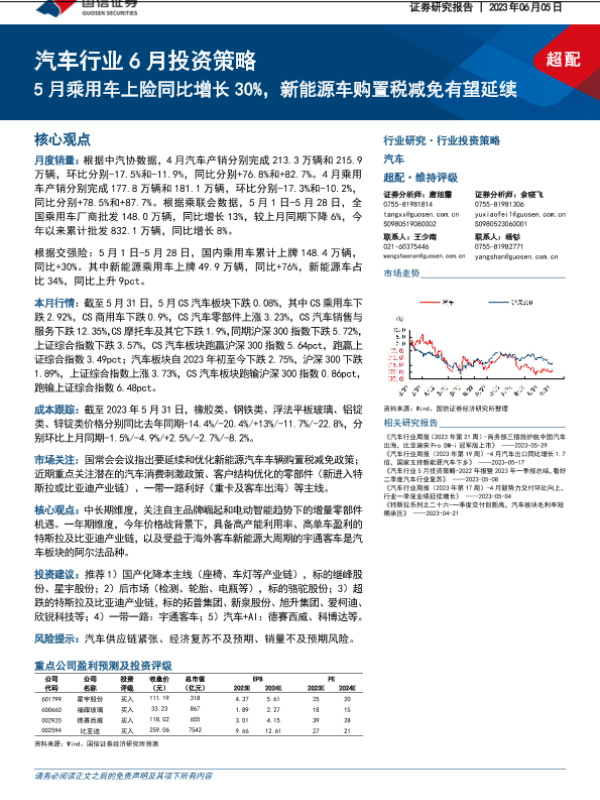 【国信证券】【20230605】汽车行业6月投资策略:5月乘用车上险同比增长30%,新能源车购置税减免有望延续-38页