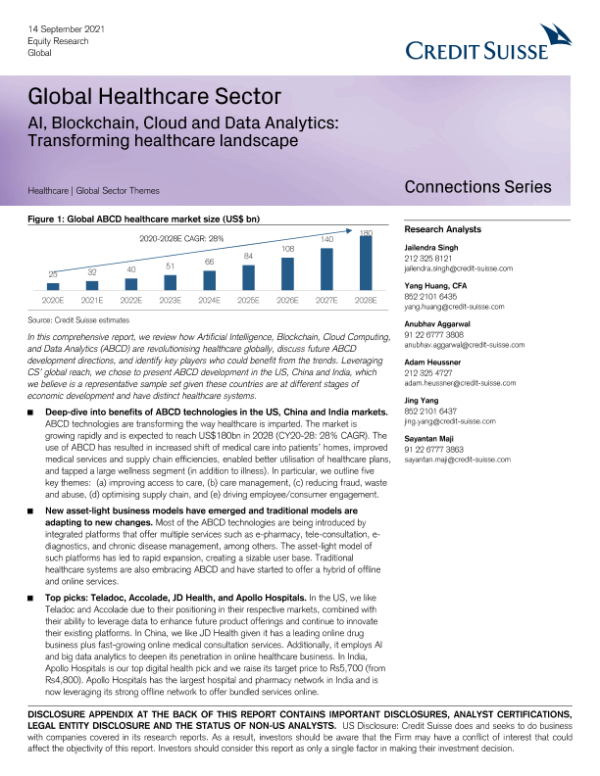 【瑞信】【20210914】全球医疗保健行业 - 人工智能、区块链、云和数据分析:改变医疗保健格局-108页