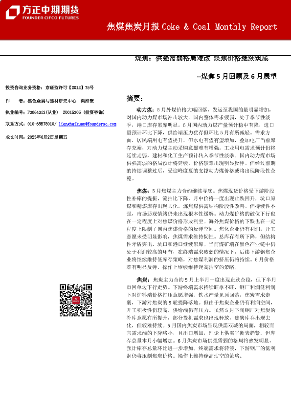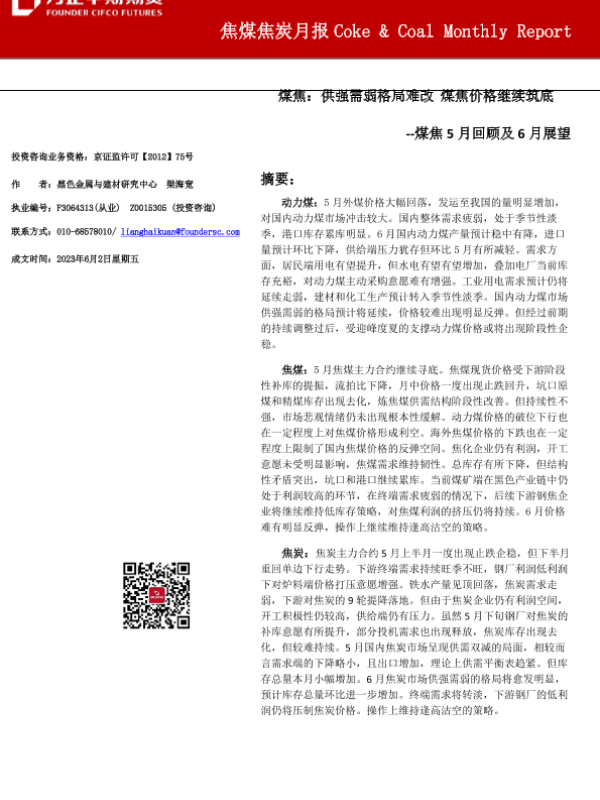 【方正中期期货】【20230602】煤焦5月回顾及6月展望:供强需弱格局难改,煤焦价格继续筑底-33页
