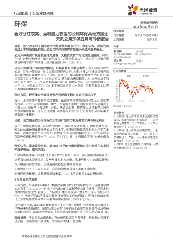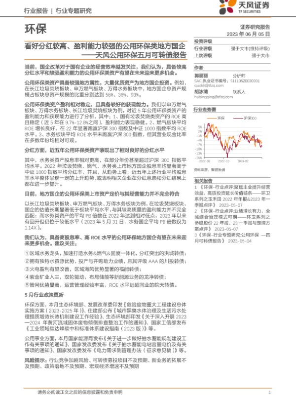 【天风证券】【20230605】环保行业天风公用环保五月可转债报告:看好分红较高、盈利能力较强的公用环保类地方国企-18页