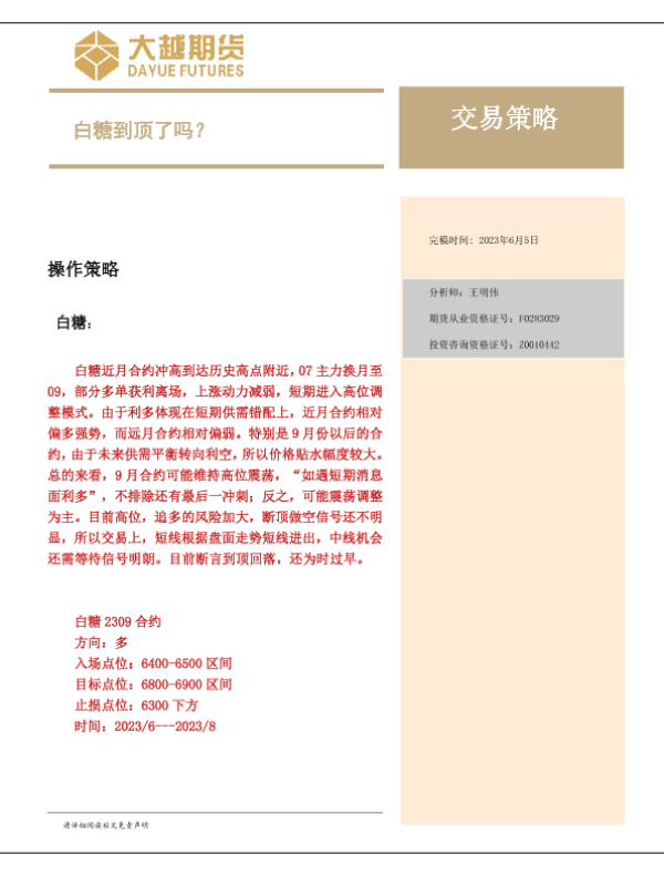 【大越期货】【20230605】白糖交易策略:白糖到顶了吗?-16页