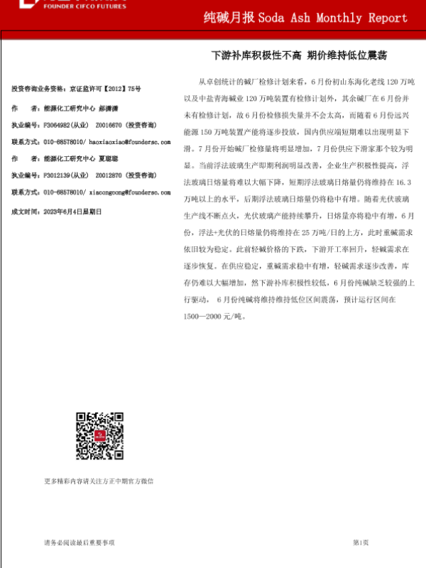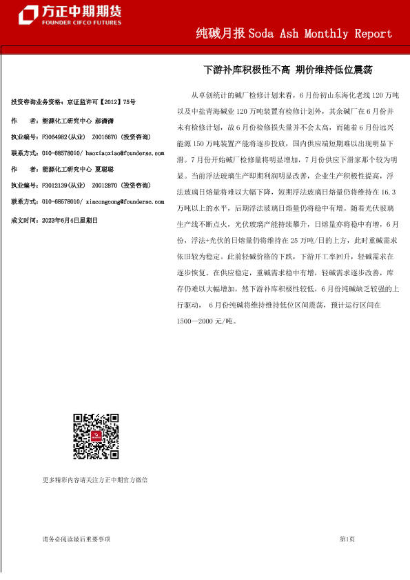 【方正中期期货】【20230604】纯碱月报:下游补库积极性不高,期价维持低位震荡-23页