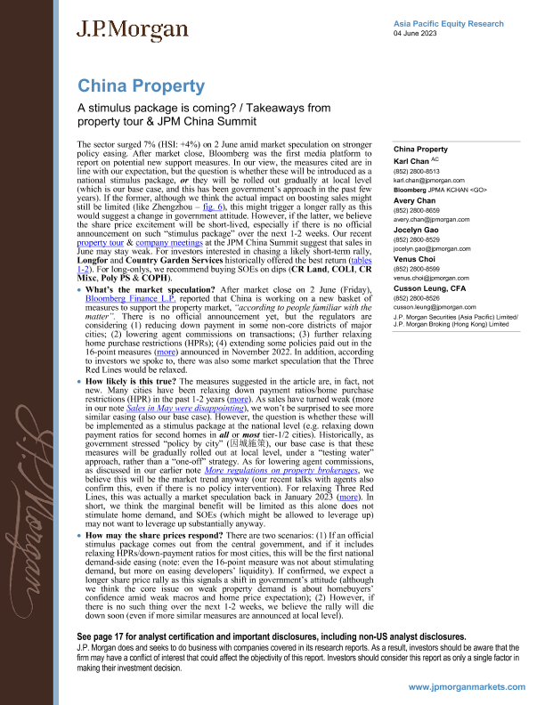 【J.P. Morgan】【20230604】中国房地产:刺激计划即将来临?——房产巡展及JPM中国峰会要点-23页