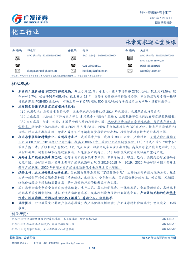 【广发证券】【20210617】化工行业:尿素需求迎三重共振-13页