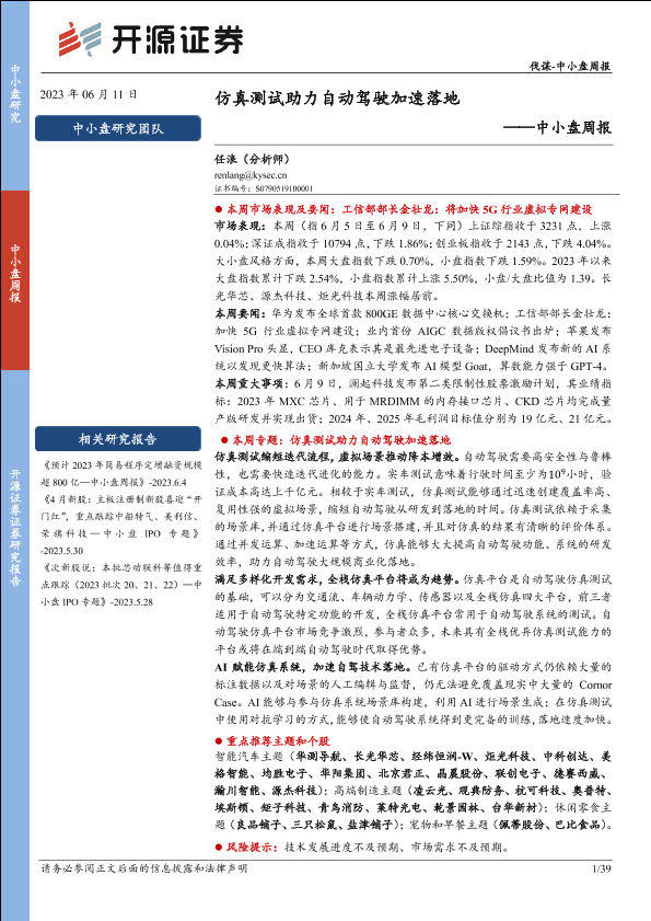 【开源证券】【20230611】中小盘周报:仿真测试助力自动驾驶加速落地-39页