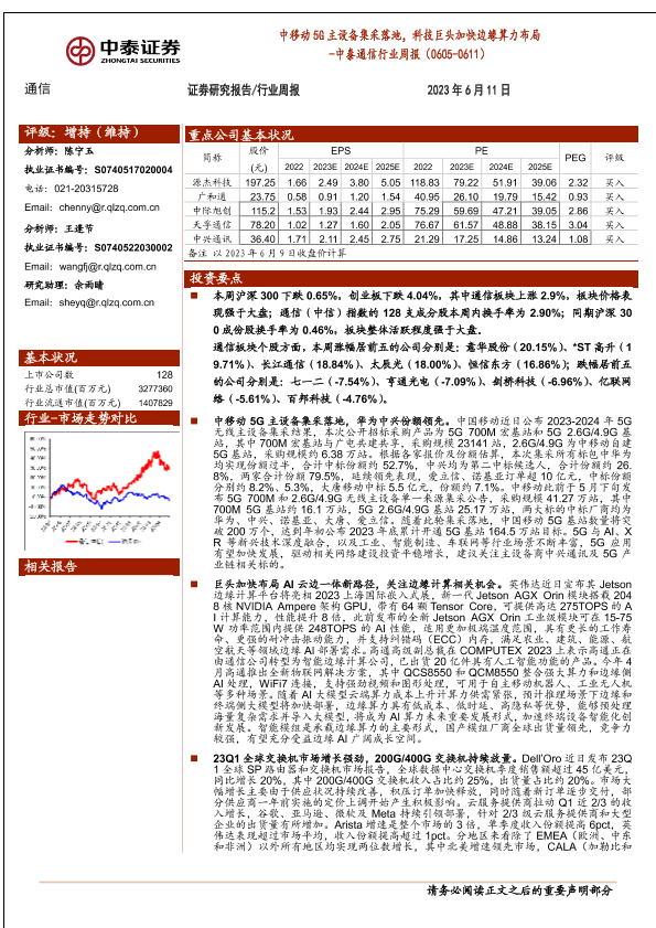 【中泰证券】【20230611】中泰通信行业周报:中移动5G主设备集采落地,科技巨头加快边缘算力布局-19页