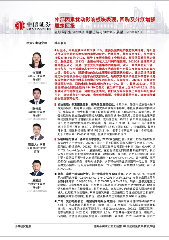 【中信证券】【20230613】互联网行业2023Q1季报总结与2023Q2展望:外部因素扰动影响板块表现,回购及分红增强股东回报-29页