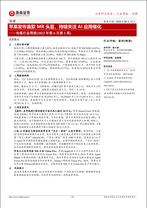 【浙商证券】【20230612】传媒行业周报(2023年第6月第2周):苹果发布首款MR头显,持续关注AI应用催化-20页