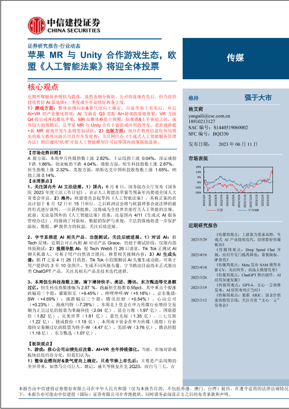 【中信建投证券】【20230611】传媒行业动态:苹果MR与Unity合作游戏生态,欧盟《人工智能法案》将迎全体投票-26页