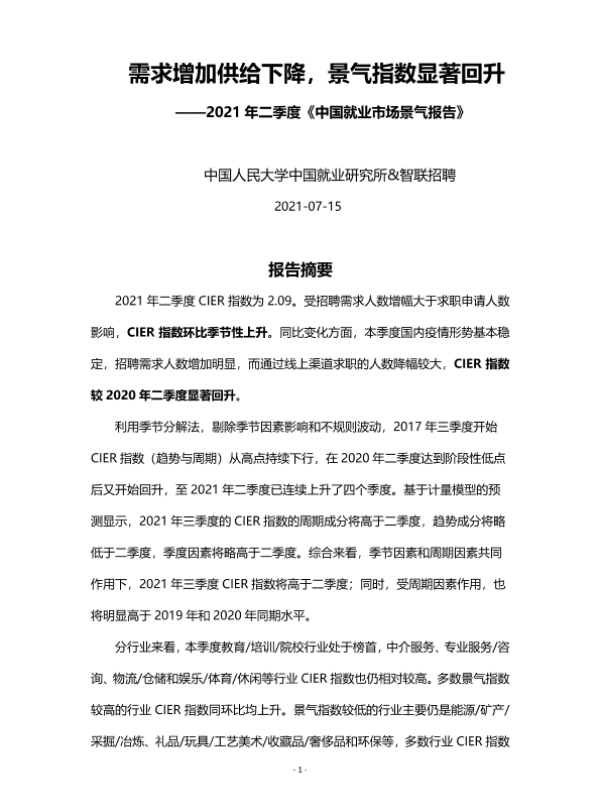 【中国人民大学中国就业研究所&智联招聘】【20210715】2021年第二季度中国就业市场景气报告-21页