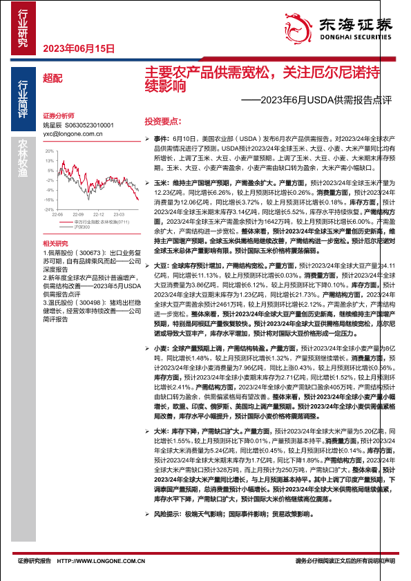 【东海证券】【20230615】农林牧渔行业2023年6月USDA供需报告点评:主要农产品供需宽松,关注厄尔尼诺持续影响-10页