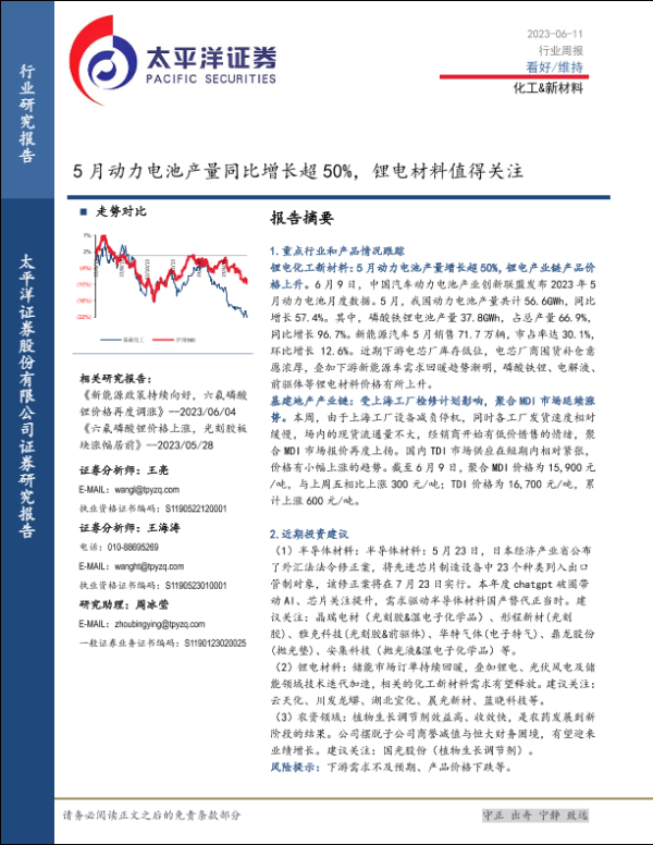 【太平洋证券】【20230611】化工&新材料行业周报:5月动力电池产量同比增长超50%,锂电材料值得关注-28页