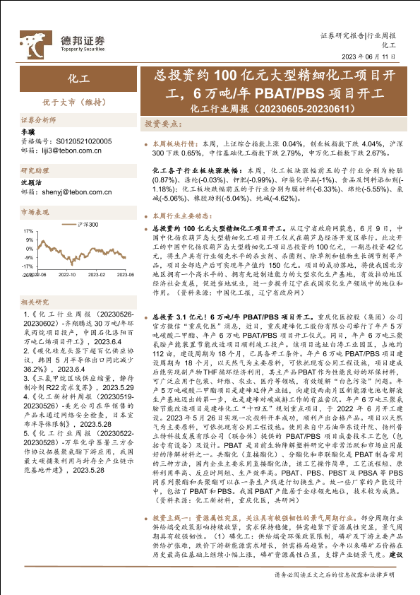 【德邦证券】【20230611】化工行业周报:总投资约100亿元大型精细化工项目开工,6万吨年PBATPBS项目开工-25页