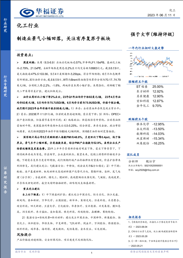 【华福证券】【20230611】化工行业:制造业景气小幅回落,关注有序复苏子板块-30页
