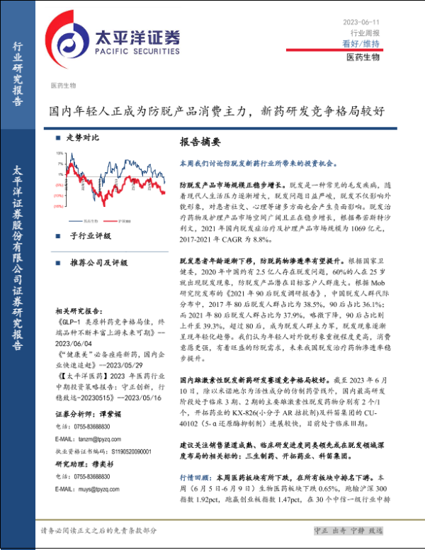 【太平洋证券】【20230611】医药生物行业周报:国内年轻人正成为防脱产品消费主力,新药研发竞争格局较好-21页