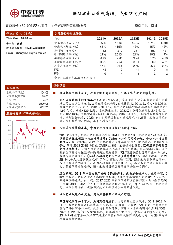 【中泰证券】【20230613】嘉益股份(301004)保温杯出口景气高增,成长空间广阔-36页