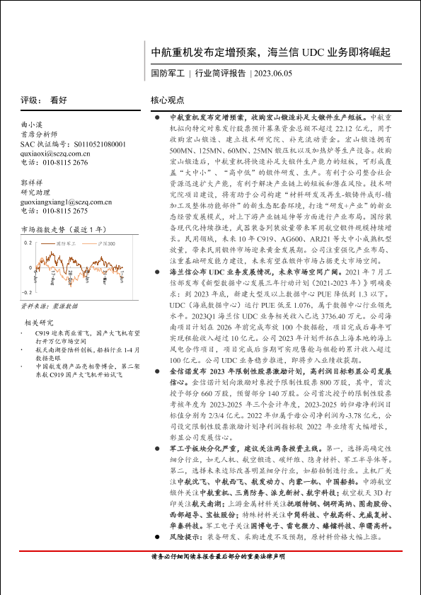 【首创证券】【20230605】国防军工行业简评报告:中航重机发布定增预案,海兰信UDC业务即将崛起-18页