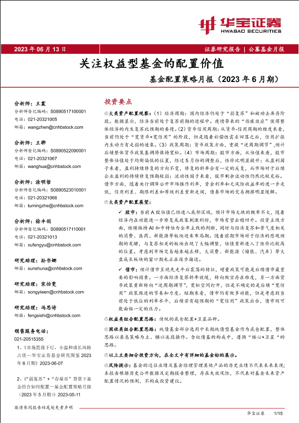 【华宝证券】【20230613】基金配置策略月报(2023年6月期):关注权益型基金的配置价值-15页
