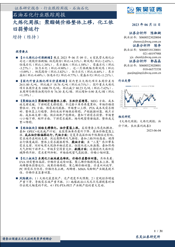 【东吴证券】【20230611】大炼化周报:聚酯链价格整体上移,化工依旧弱势运行-31页