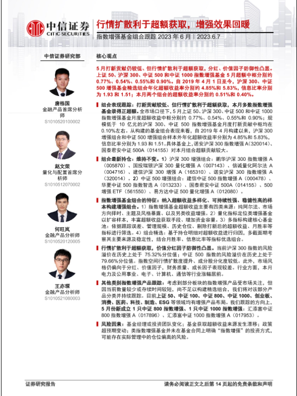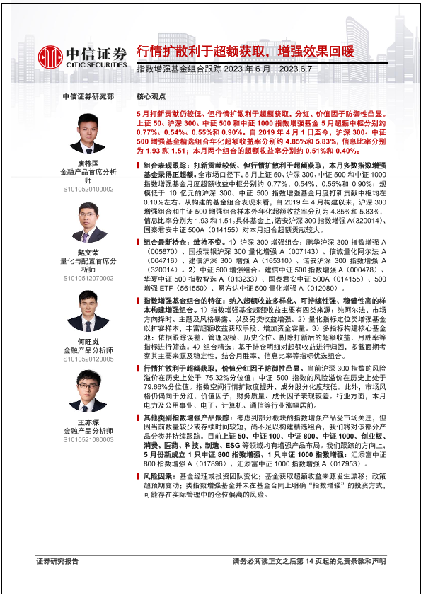 【中信证券】【20230607】指数增强基金组合跟踪2023年6月:行情扩散利于超额获取,增强效果回暖-15页