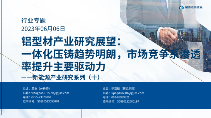 【国泰君安证券】【20230606】新能源行业产业研究系列(十):铝型材产业研究展望,一体化压铸趋势明朗,市场竞争系渗透率提升主要驱动力-23页