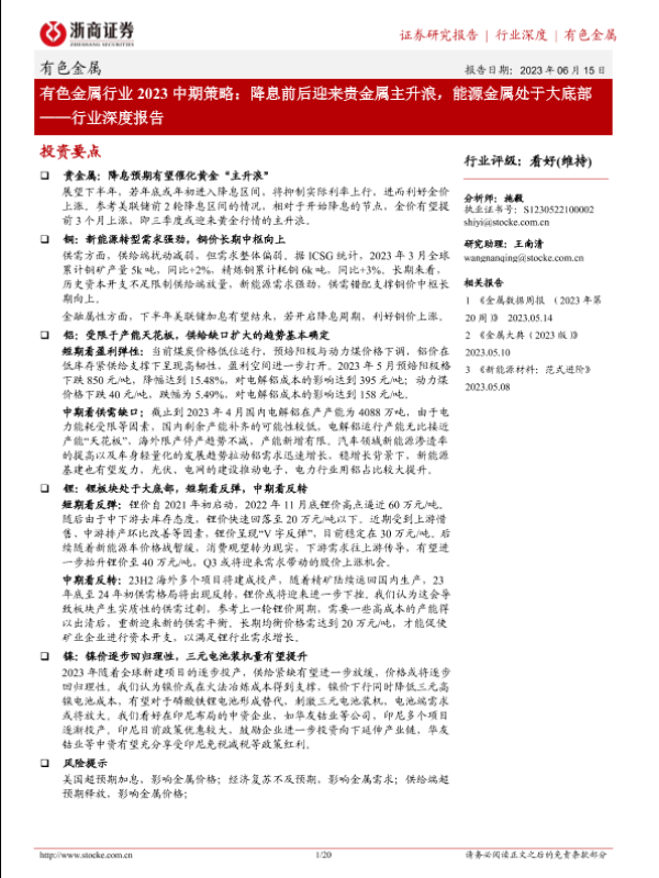 【浙商证券】【20230615】有色金属行业2023中期策略:降息前后迎来贵金属主升浪,能源金属处于大底部-20页