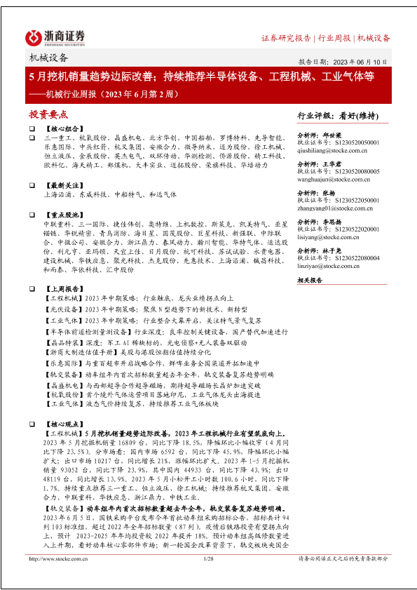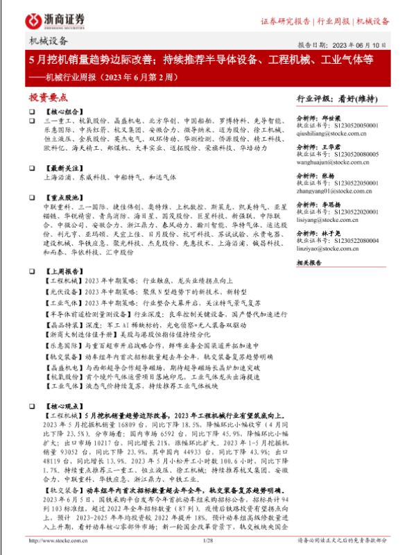 【浙商证券】【20230610】机械行业周报(2023年6月第2周):5月挖机销量趋势边际改善;持续推荐半导体设备、工程机械、工业气体等-28页