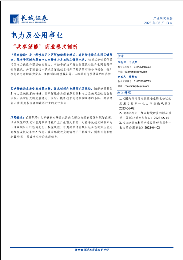 【长城证券】【20230613】电力及公用事业行业:“共享储能”商业模式剖析-17页