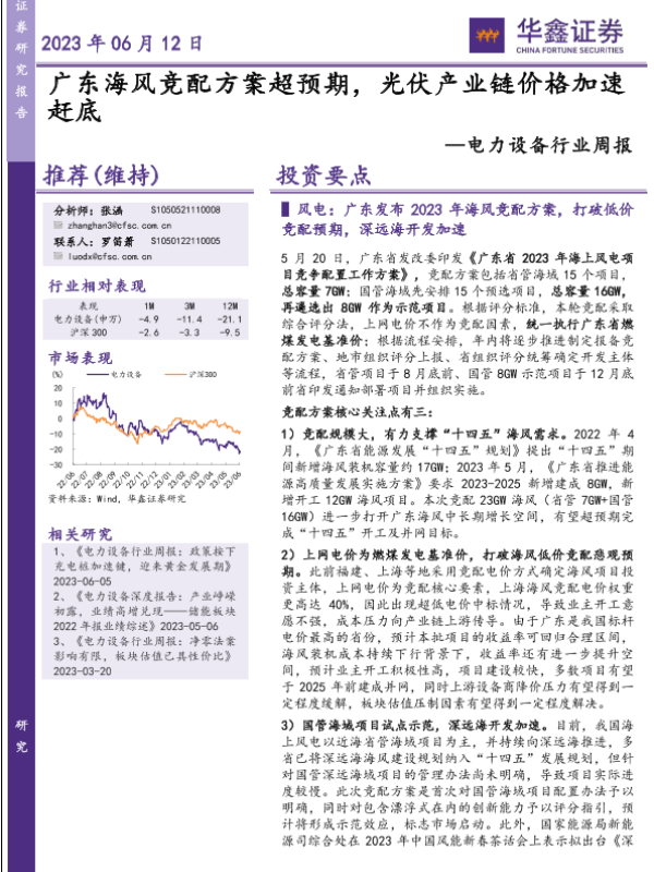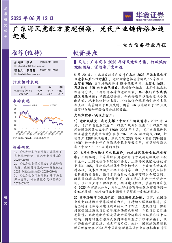 【华鑫证券】【20230612】电力设备行业周报:广东海风竞配方案超预期,光伏产业链价格加速赶底-15页
