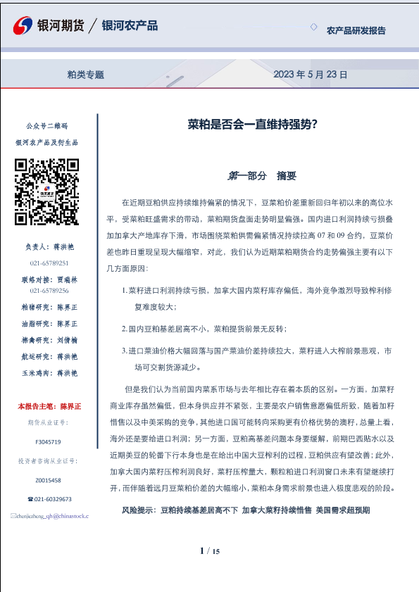 【银河期货】【20230523】粕类专题:菜粕是否会一直维持强势?-15页