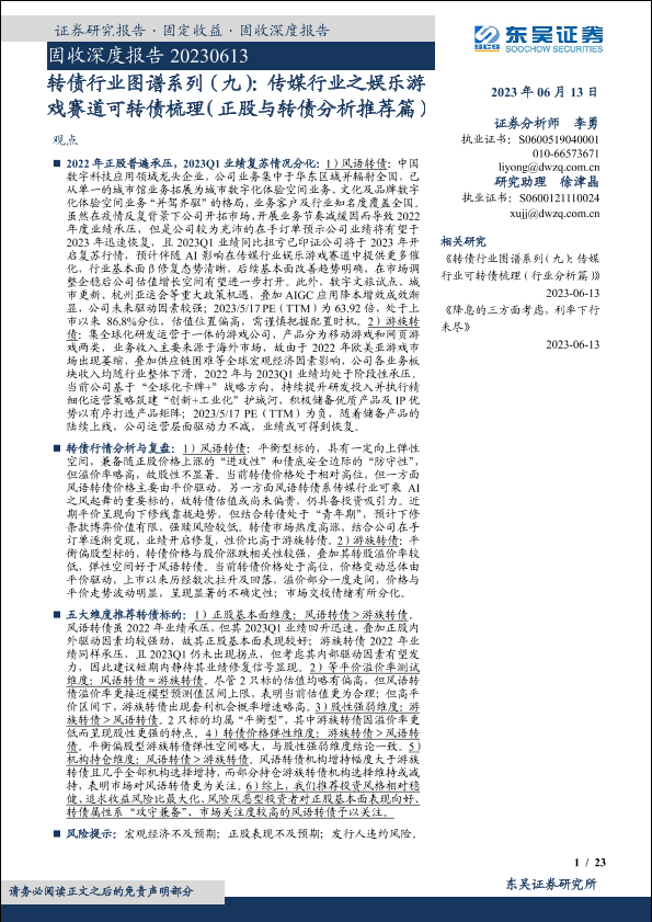 【东吴证券】【20230613】转债行业图谱系列(九):传媒行业之娱乐游戏赛道可转债梳理(正股与转债分析推荐篇)-23页