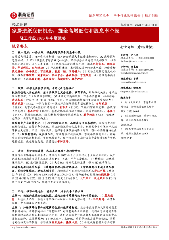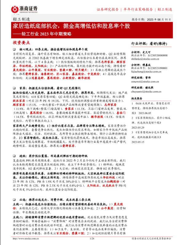 【浙商证券】【20230611】轻工行业2023年中期策略:家居造纸底部机会,掘金高增低估和股息率个股-26页