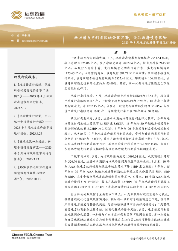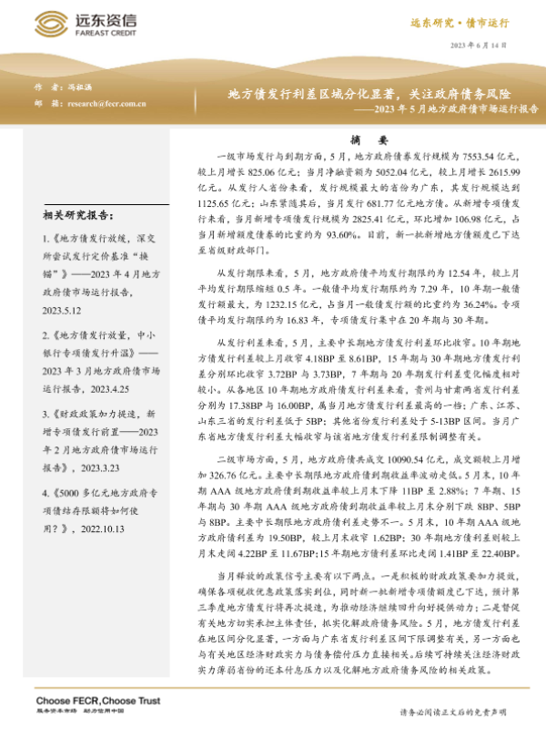 【远东资信】【20230614】地方债发行利差区域分化显著,关注政府债务风险——2023年5月地方政府债市场运行报告-12页