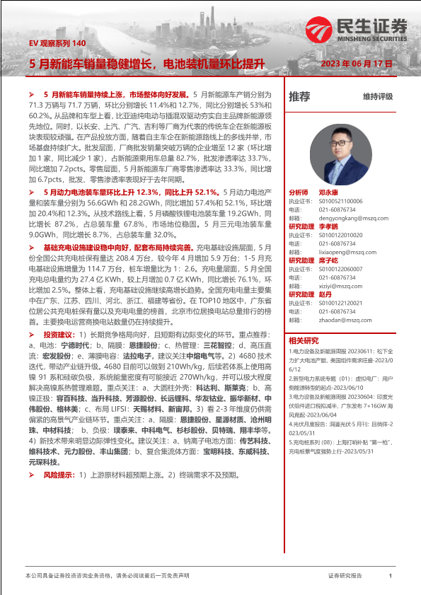 【民生证券】【20230617】EV观察系列140:5月新能车销量稳健增长,电池装机量环比提升-20页
