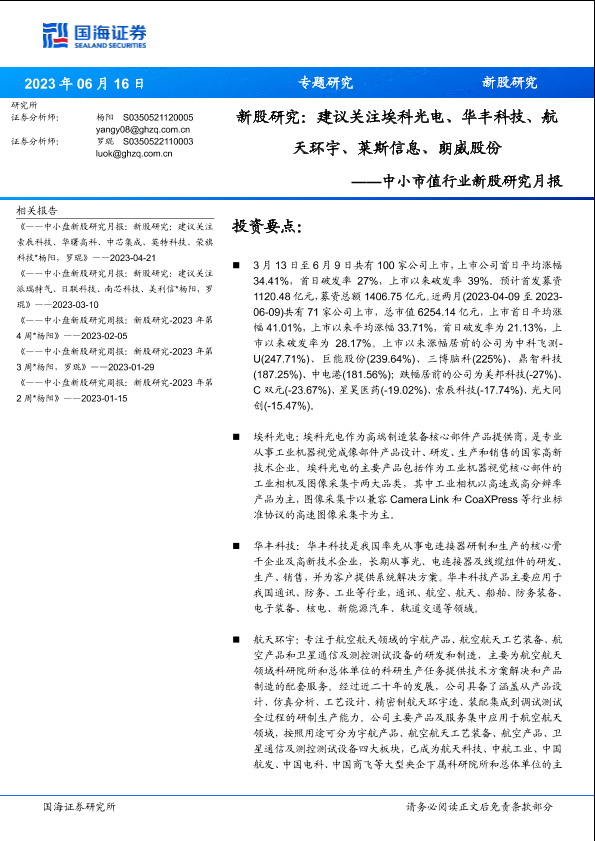 【国海证券】【20230616】中小市值行业新股研究月报:新股研究,建议关注埃科光电、华丰科技、航天环宇、莱斯信息、朗威股份-35页