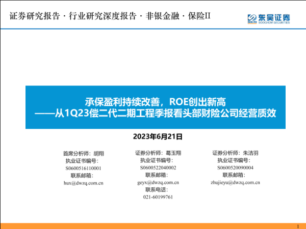 【东吴证券】【20230621】保险II行业研究深度报告:从1Q23偿二代二期工程季报看头部财险公司经营质效-承保盈利持续改善,ROE创出新高-58页