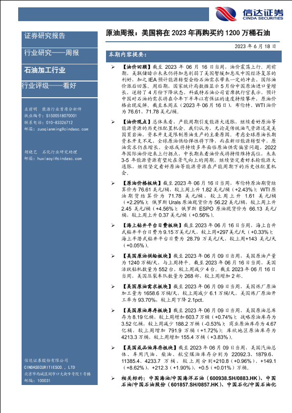 【信达证券】【20230618】原油周报:美国将在2023年再购买约1200万桶石油-26页