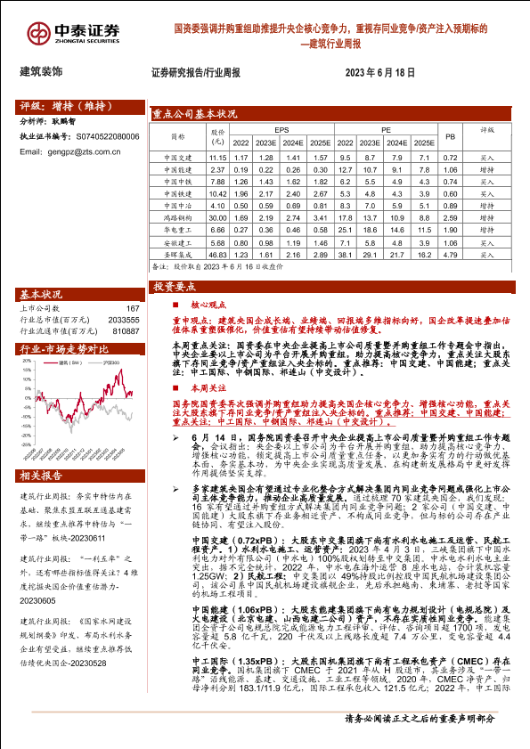 【中泰证券】【20230618】建筑行业周报:国资委强调并购重组助推提升央企核心竞争力,重视存同业竞争/资产注入预期标的-28页