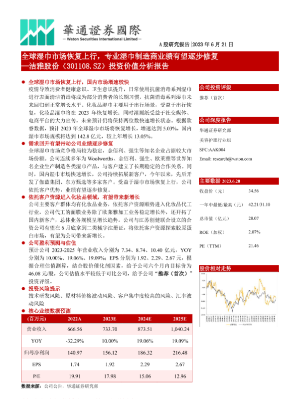 【华通证券国际】【20230621】投资价值分析报告:全球湿巾市场恢复上行,专业湿巾制造商业绩有望逐步修复-20页