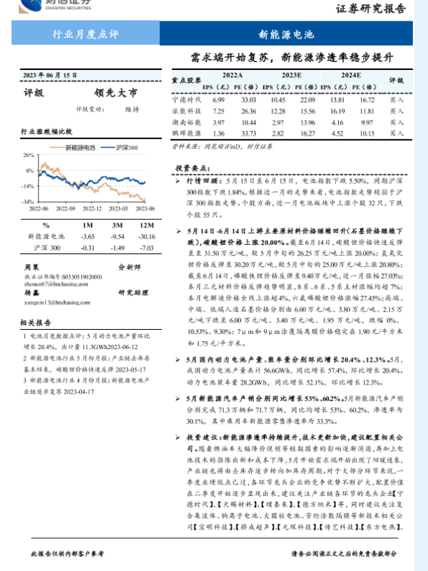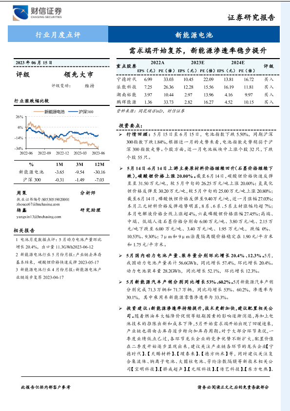 【财信证券】【20230615】新能源电池行业月度点评:需求端开始复苏,新能源渗透率稳步提升-17页