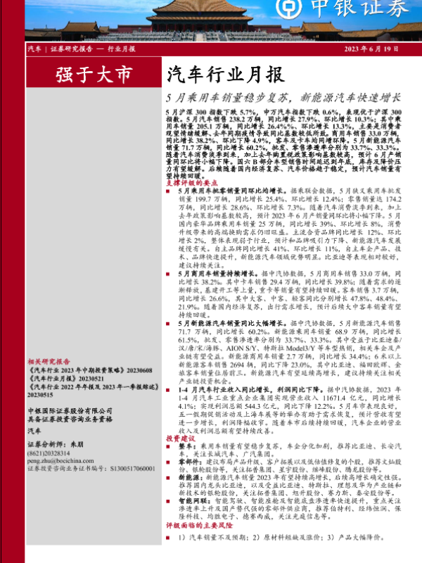【中银证券】【20230619】汽车行业月报:5月乘用车销量稳步复苏,新能源汽车快速增长-15页